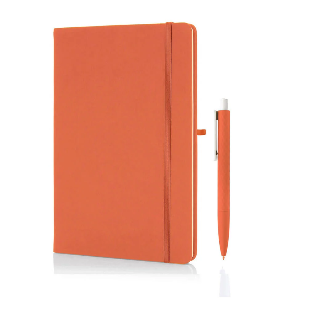 Notebook and pen set consisting of a hard cover soft touch PU notebook with a matching color pen with geometric design. The round cornered notebook consists of 160 ruled pages, 70 gsm with matching colored 3mm elastic closure, a bookmark and a pen loop. Packed in a nice white gift box.