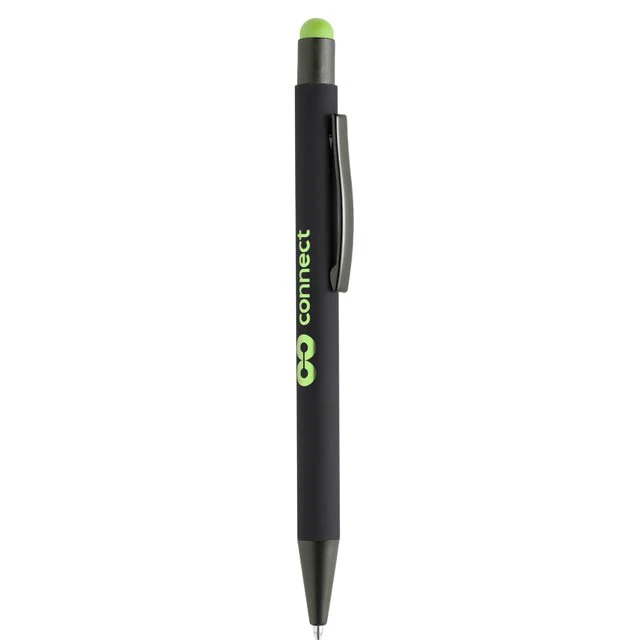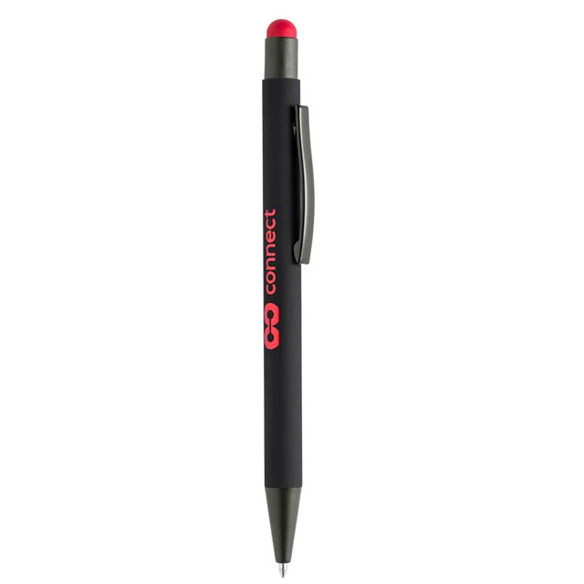 Ballpoint pen with twist mechanism, body in solid black color and stylus in a wide range of colors. Contrast Gun metal trims. Especially designed for laser engraving, including a special coating for your logo to be properly engraved in matching color with the stylus. With 1200 m writing length and German Dokumental® Ink.