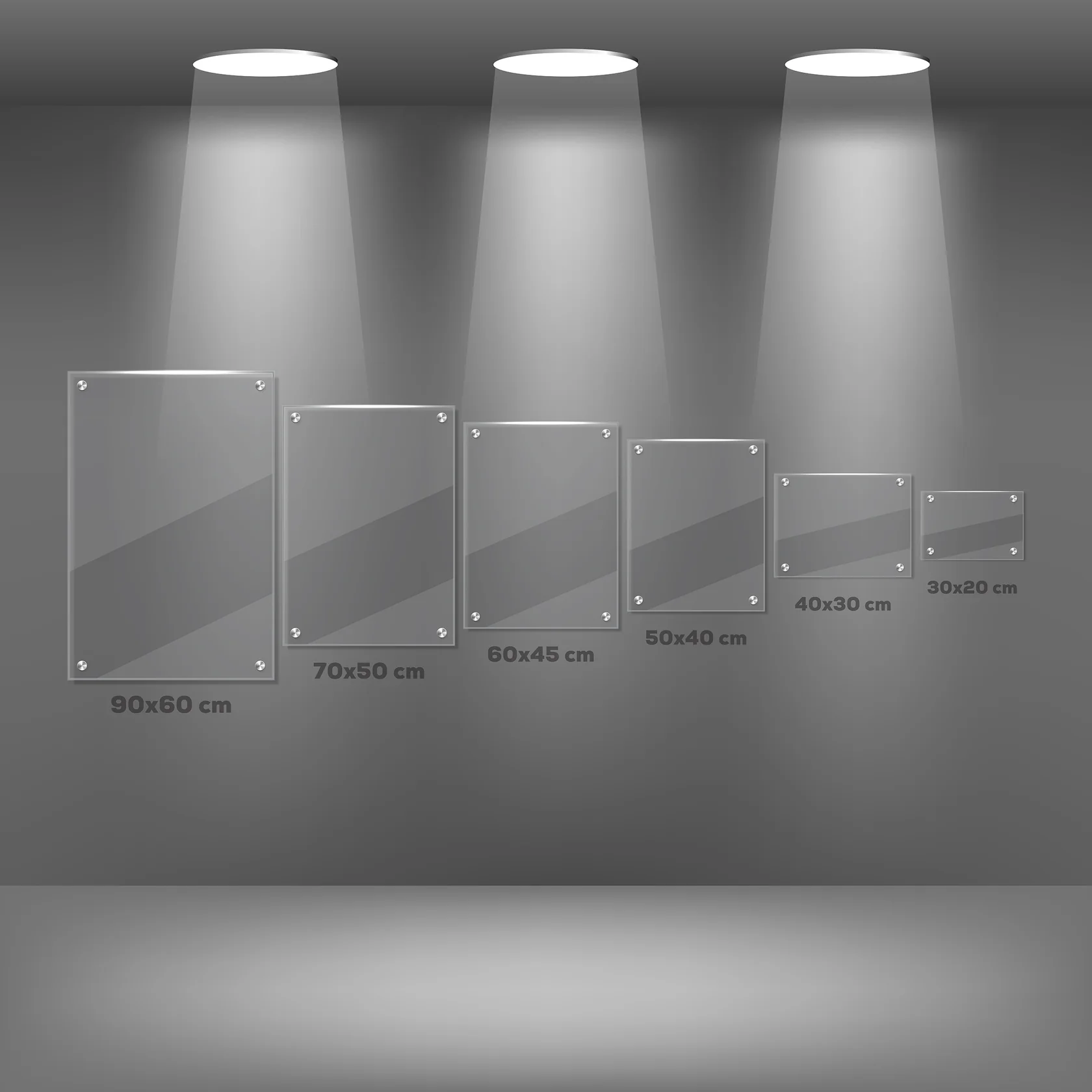 Acrylic Size: 40 x 30 cm (Horizontal or Vertical) Acrylic Thickness: 5mm Printed PVC Vinyl Transferred on Acrylic Sheet Stainless Steel Spacers: 4 pcs Installation Not Included