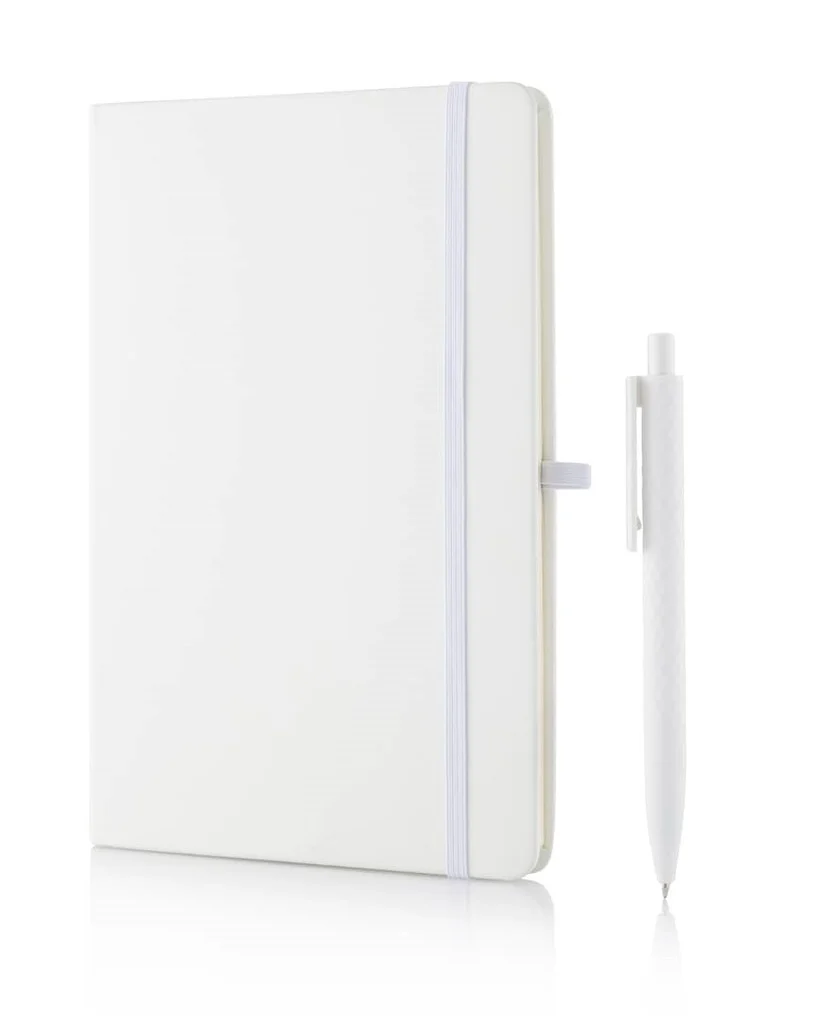 Notebook and pen set consisting of a hard cover soft touch PU notebook with a matching color pen with geometric design. The round cornered notebook consists of 160 ruled pages, 70 gsm with matching colored 3mm elastic closure, a bookmark and a pen loop. Packed in a nice white gift box.
